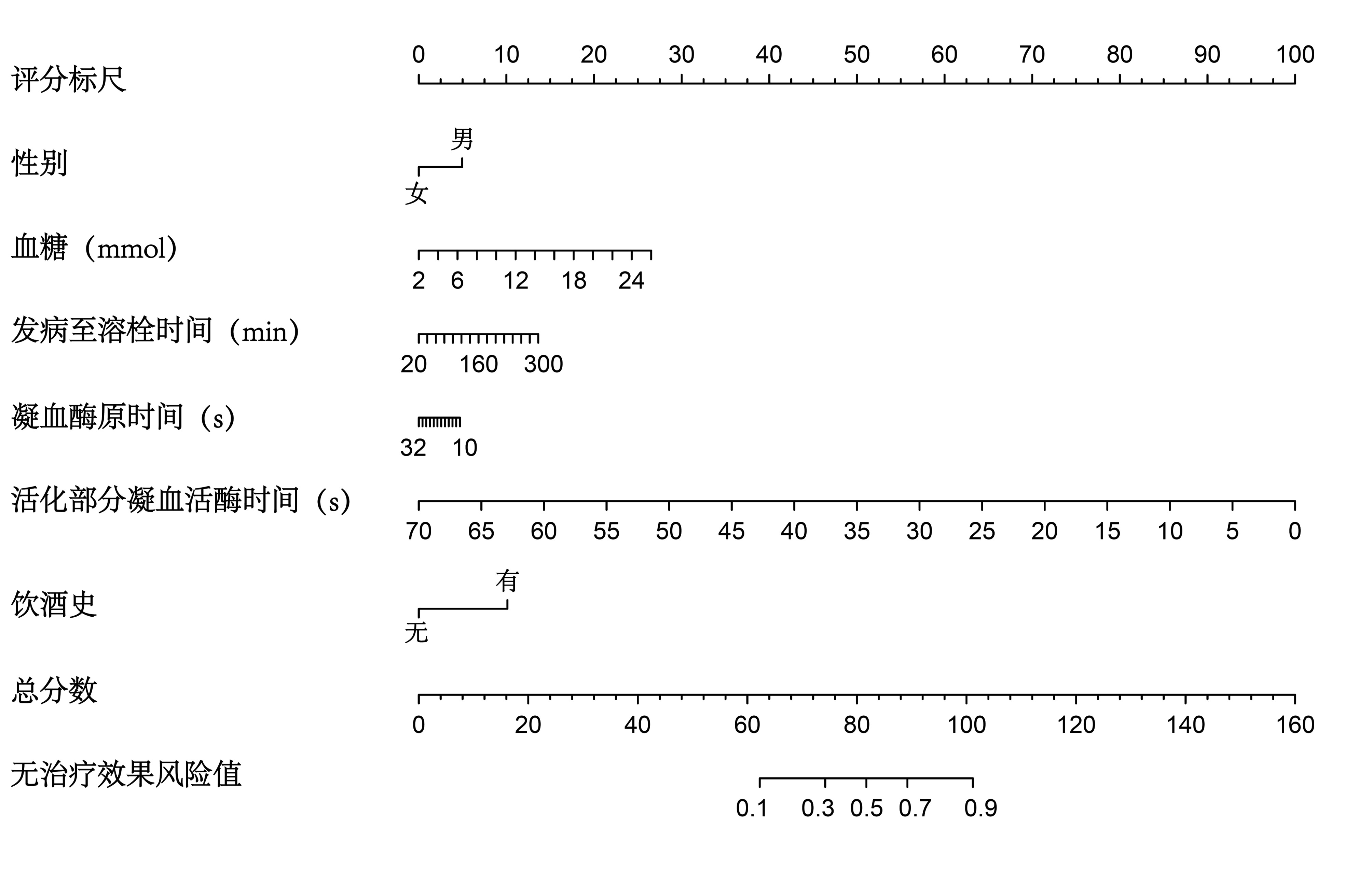 | 图 5 预测急性缺血性脑卒中患者静脉溶栓治疗效果列线图的使用方法举例 |