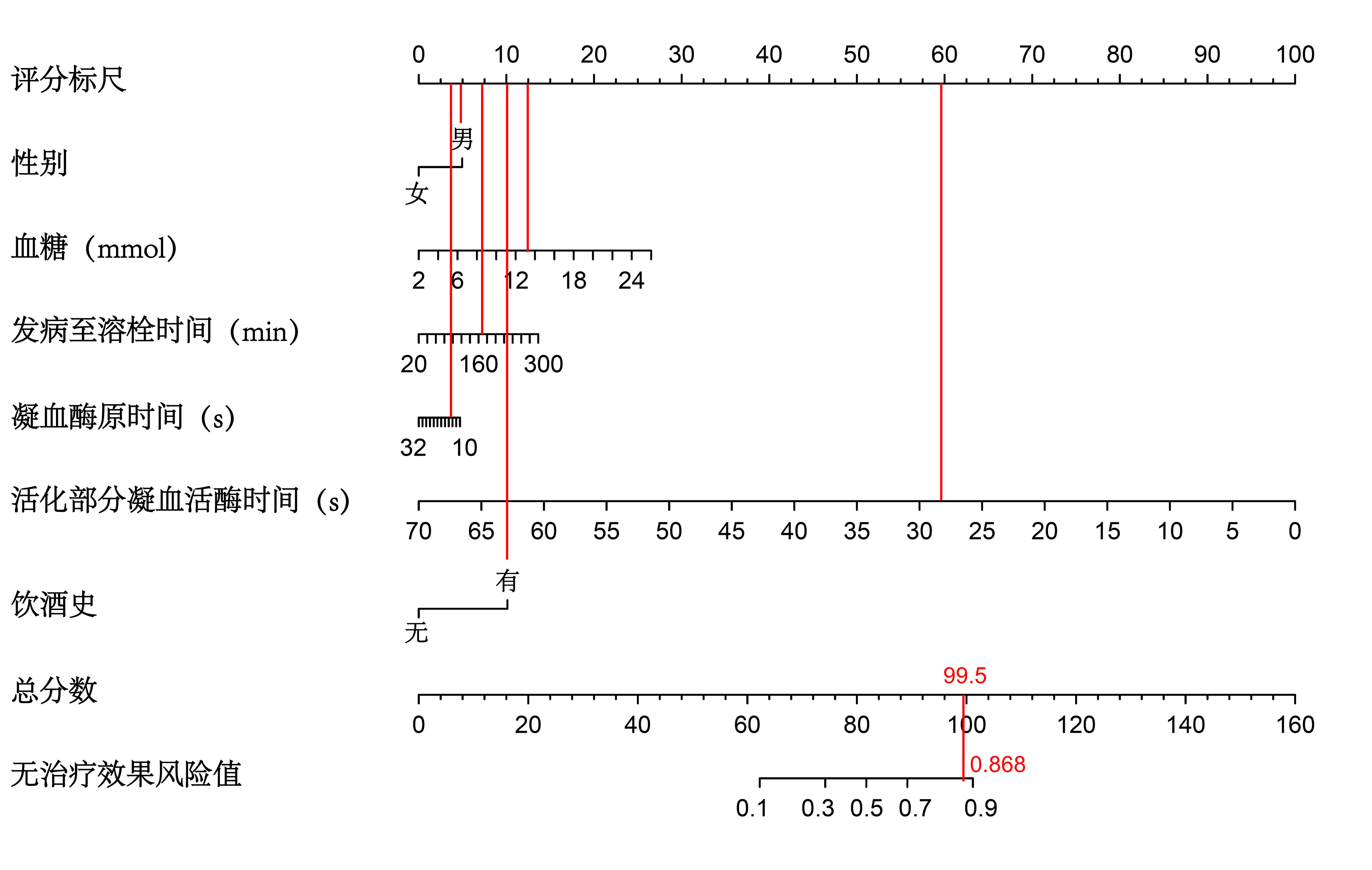 采用R统计软件中的“rms”分析包绘制列线图,将多因素逻辑回归分析建立的疗效预测模型进行可视化判别(图 4)。在临床应用中,医生可将风险因子指标状况对应的分数相加得到总分,并根据总分得到静脉溶栓疗效不佳的概率。例如患者为男性,有饮酒史,血糖浓度为13.1 mmol,发病至静脉溶栓时间为165 min,凝血酶原时间为13.8 s,活化部分凝血活酶时间为28s,则对应的总分为4.9+10.5+12.0+7.4+5.0+59.7=99.5,对应的治疗效果不佳风险值为86.8%(图 5)。医生在决策实施静脉溶栓医患沟通时,可以据此清晰说明患者获益情况。