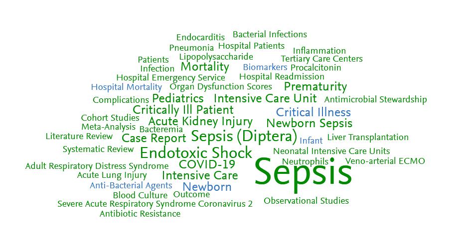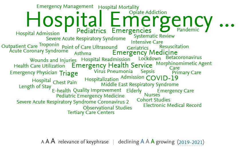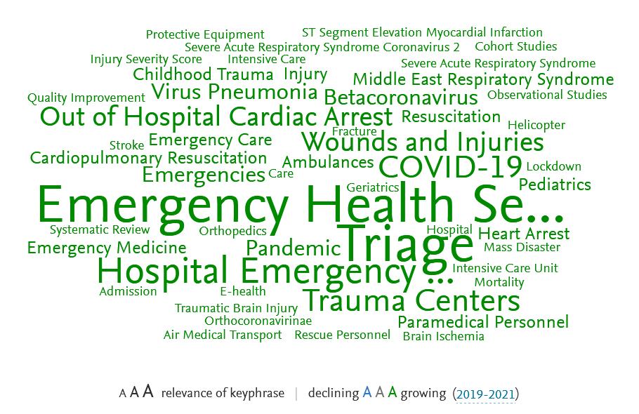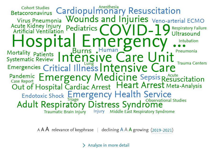 我国的急诊医学经历多年的发展进入了新的阶段,提升、丰富急诊医学科的内涵,高质量地发展急诊医学科[1]则显得更为重要,而科学研究作为学科可持续发展的助推器,急诊医学的科研必将在未来的学科发展与壮大中发挥更重要的作用。笔者尝试通过文献计量学(词频分析工具Scival等)的方法(检索库:Web of Science, 文献检索时间为2019 —2021年,纳入文献84 293篇),结合笔者微信公众号“急危重症医学资讯”555期的文献之重点梳理,探寻未来急危重症医学研究的热点和发展方向,以期为急危重症医学科同道们提供参考。