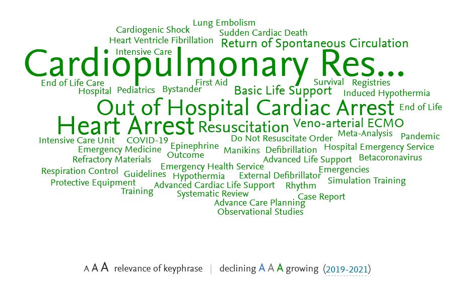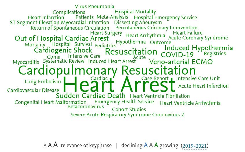 心肺复苏相关研究前8位的关键词分别为院外心脏骤停,复苏,V-A ECMO, 恢复自主循环, 基础生命支持,紧急医疗服务,体外除颤,旁观者。心肺复苏相关的研究聚焦在了V-A ECMO支持下的复苏,复苏成功标志依旧停留在恢复自主循环(但新的更精准,更具有预测性的指标仍在探寻),紧急医疗服务在体外除颤、旁观者的指导与培训、基础生命支持上的服务能力还有更多有待提高的地方,是研究的热点。通过梳理“急危重症医学资讯”的相关内容,可以发现科技的进步(ChatGPT、人工智能、5G,智能手机,智能反馈)与心肺复苏的教学与培训融合的相关研究很多,心肺复苏过程中的被动通气、按压中断等传统研究热点和新技术如ECPR(血流管理、平均动脉压力目标等)的应用于优化、亚低温的效果(目标温度的管理策略与效果)仍有持续的争论,寻求早期的预测心肺复苏后患者神经功能的努力(评分系统、血清标记物、经胸超声心动图、影像学特征等)一直在进行中,但并没有特别有效的结果,见图 6。