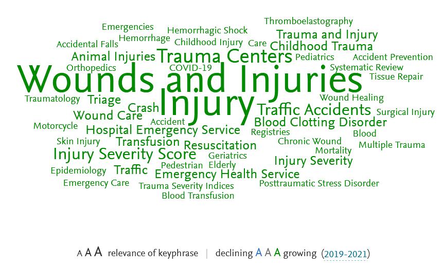 创伤相关研究前8位的关键词分别为创伤中心、创伤服务评分、交通事故、儿童创伤、输血、碰撞、复苏、院内急诊医疗服务。交通事故相关的创伤是最大病因,对创伤中心的建设与医疗救治能力关注是全球的热点,创伤救治中的难点与热点更多的聚焦在输血与复苏上,而创伤患者的救治能力是院内急诊医疗服务的体现,见图 5。