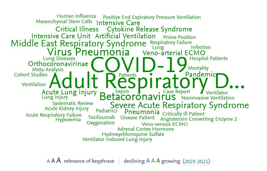 ARDS相关研究前8位的关键词分别为新冠病毒、病毒性肺炎、中东呼吸综合征、V-A ECMO,机械通气、肺炎、细胞因子释放综合征。这次关键词说明了对于ARDS患者,除了传统的呼吸机支持以外,V-A ECMO的应用也成为热点;同时仍然有其他的新型呼吸系统综合征出现,而炎症因子的释放是呼吸窘迫综合征的重要致病因素,而针对炎症因子的释放干预是未来的研究热点。通过梳理“急危重症医学资讯”的相关内容,可以发现针国际上对ARDS的病理生理学改变有了更深层次的认识,乃至从定义、表型分型、呼吸支持的不同策略(潮气量/高压肺复张/PEEP滴定/俯卧位/连续输注神经肌肉阻滞剂/ECMO/体外二氧化碳清除)方面都有新的认识[5],同时,也在进行更大样本的研究与验证,尤其是针对特殊人群(老人/孩童/肥胖者),见图 7。