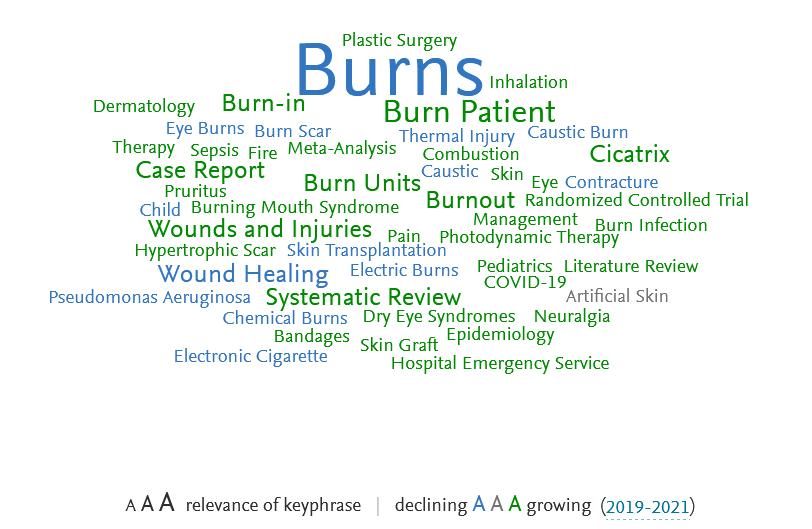 烧伤相关研究前8位的关键词分别为烧伤单元、伤口和损伤、伤口愈合、瘢痕、灼口综合征、化学烧伤、儿童、疼痛。关于国际上烧伤研究的热点,更多集中在专业的救治单元,伤口的处置和愈合、瘢痕等不仅关系到预后,也关系到患者与社会的再融合,化学烧伤的患者与救治也成为社会发展的新热点,烧伤患者的疼痛管理也是烧伤患者救治过程中应关注的问题。急危重症相关的烧伤多为烧创伤(复合伤),并和突发公共卫生事件有关,相关患者的全流程救治与管理则更显重要,见图 9。