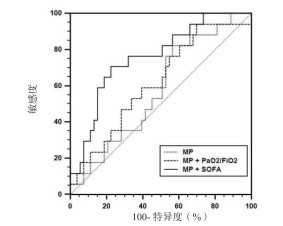 | 图 1 MP、MP联合PaO2/FiO2、SOFA评分预测机械通气患者院内死亡的ROC曲线 Fig 1 The AUCs of MP, MP combined with PaO2/FiO2 and the MP combined with SOFA score for predicting in-hospital death with invasive mechanical ventilation |