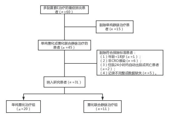 由于高发病率和高病死率,碳青霉烯耐药革兰阴性杆菌(CRO)感染备受关注[1],世界卫生组织(WHO)和美国疾病控制中心(CDC)均把CRO的危险级别确定为首要等级[2],而我国CRO感染情况也非常严峻。如何有效预防和治疗CRO性重症肺炎迫在眉睫。多黏菌素仍是目前治疗CRO的主要抗生素,在临床上广泛使用,但国内外关于多黏菌素E单纯雾化与雾化联合静脉方案对CRO重症肺炎治疗的有效性及安全性研究较少。本研究通过回顾性比较分析31例CRO重症肺炎患者临床资料,旨在探索多黏菌素E单纯雾化与雾化联合静脉两种治疗方法的有效性和安全性,为临床医生治疗CRO重症肺炎提供一种有效和安全的治疗选择。