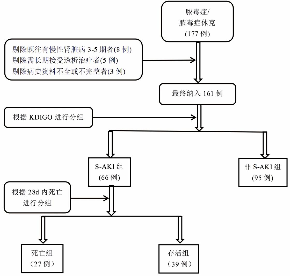 1 资料与方法 1.1 一般资料本研究为一项单中心、观察性队列研究。研究对象选取2021年9月至2022年9月期间泰州市人民医院重症医学科新收治的符合脓毒症/脓毒症休克的患者。所有患者一经确诊均早期使用集束化治疗策略。随访患者,根据患者是否发生AKI,分为SA-AKI组和非SA-AKI组;对于SA-AKI患者继续随访至28 d的临床结局,分为死亡组和存活组。纳入标准:年龄≥18岁;符合脓毒症/脓毒性休克的诊断标准。排除标准:处于妊娠期或哺乳期的妇女;非感染性休克所致AKI者;有慢性肾脏病3~5期或肾脏手术后;需长期接受透析治疗者;病史资料缺失或不完整者。