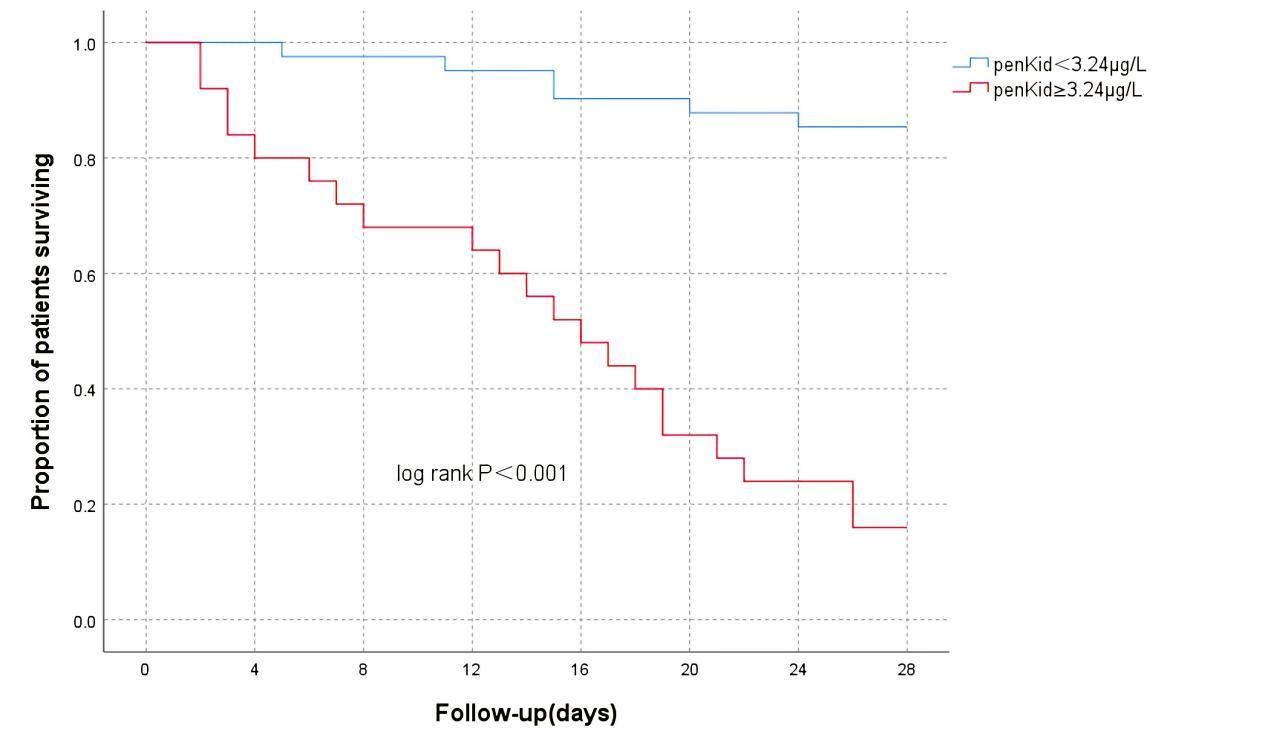 | 图 2 基线penKid≥3.24 μg/L及penKid<3.24 μg/L患者28 d生存曲线 Fig 2 28-day survival curve for patients with baseline penKid ≥ 3.24 μg/L and penKid < 3.24 μg/L |