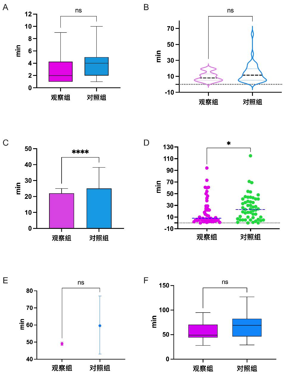 观察组10人(14.9%)建立安全气道,用时2(1.00,4.25)min,对照组22人(29.3%)建立安全气道,用时4(2,5)min,差异无统计学意义(P=0.1510),见图 4A。观察组25人(25.4%)行FAST检查,用时8(5,13)min,对照组36人(37.3%)行FAST检查,用时11(5.0,19.5)min,差异无统计学意义(P=0.1911),见图 4B。观察组62人(92.5%)行CT检查,用时22(18.75,25.00)min,对照组76人(78.7%)行CT检查,用时25(21.00,38.25)min,差异有统计学意义(P<0.0001),见图 4C。观察组50人(74.6%)MDT,用时8(4,26)min,对照组51人(68%)MDT,用时23(7,41)min,差异有统计学意义(P=0.0320),见图 4D。观察组3人(4.5%)输血,用时49(48,50)min,对照组5人(6.7%)输血,用时58(49.5,70.5)min,差异无统计学意义(P=0.2500),见图 2E。观察组16人(23.9%)手术,术前准备平均用时49(44.25,68.25)min,对照组20人(26.7%)手术,术前准备用时66.50(46.25,82.50)min,差异无统计学意义(P=0.1605),见图 4F。