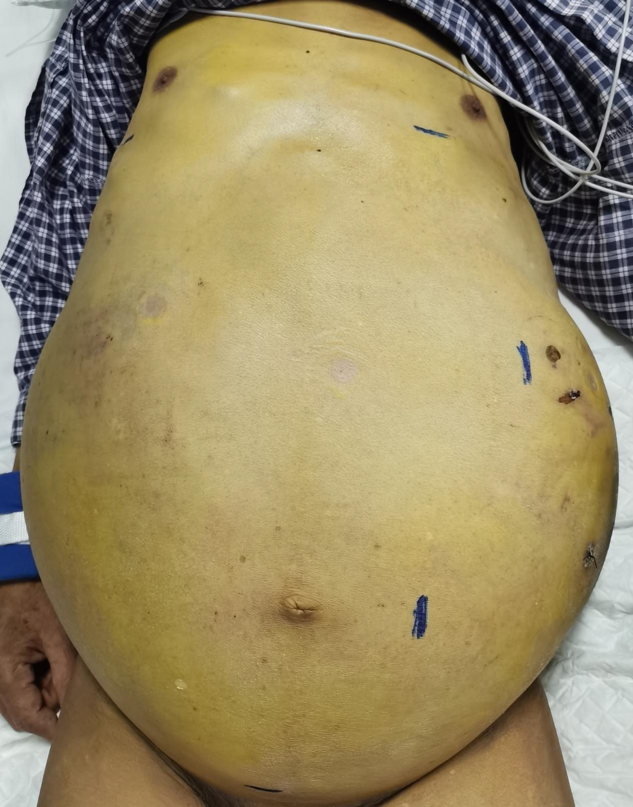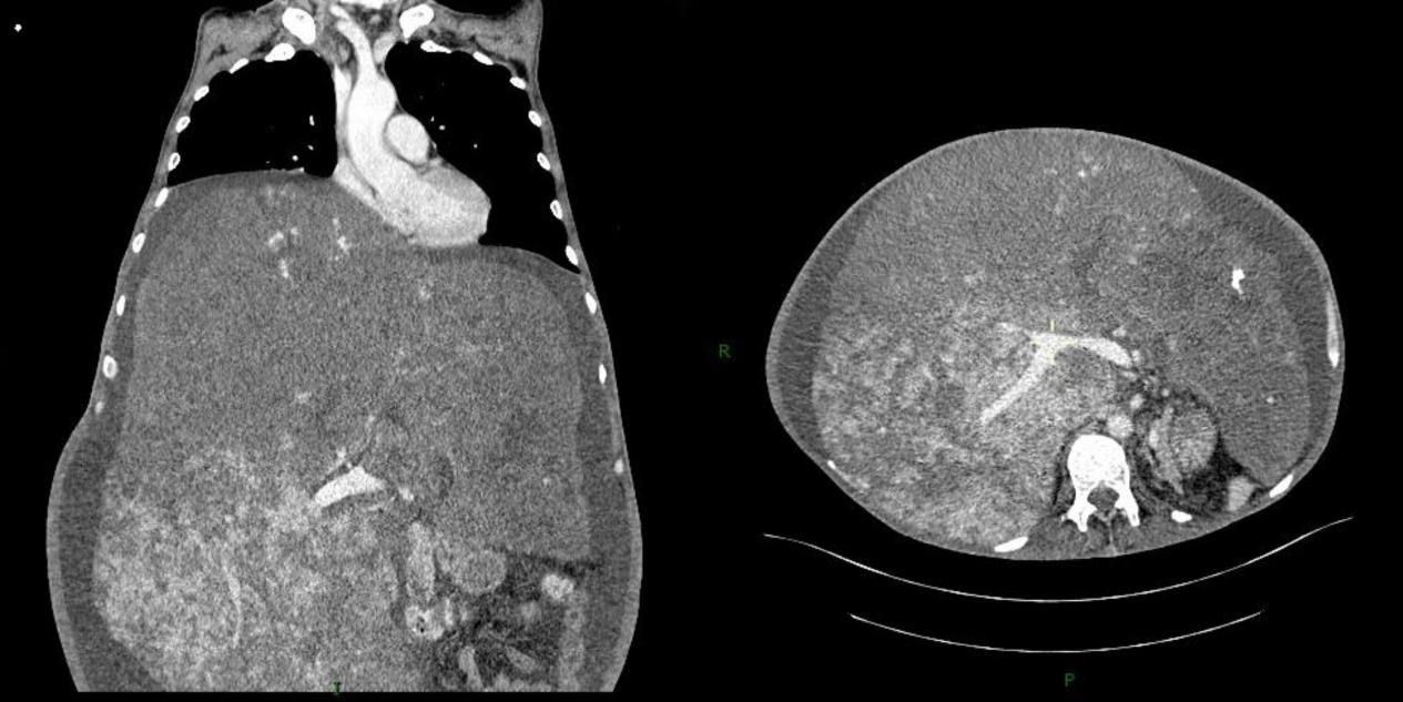 患者男,57岁,2020年11月30日因脑出血就诊于当地医院,治疗期间腹胀突然加重,随后转诊至本院。患者有轻度腹胀10余年病史,从未做过任何相关检查,也未服用过任何药物,否认肝炎、结核等病史。入院查体:患者使用气管插管和呼吸机进行辅助通气,全身皮肤黏膜黄染、可见散在瘀斑,严重腹胀,腹部有轻压痛,体格检查及超声检查结果均提示肝下界在前正中线上达脐水平线下8 cm处(图 1),脾脏未触及,双下肢中等程度水肿。实验室检查发现许多异常,包括红细胞2.52×1012/L、血红蛋白82 g/L和血小板63×109/L,白蛋白34.6 g/L,凝血酶原时间15.6 s,活化部分凝血酶时间46.8 s,纤维蛋白原0.62 g/L,D-二聚体31.09 mg/L等。乙肝抗原、丙型肝炎病毒抗体检测均为阴性,血清肿瘤标志物均在正常范围内。超声检查提示肝脏体积巨大,肝脏内探及大小不一的不均质回声团,边界不清。普通CT扫描检查提示:肝脏体积明显增大(约44.06 cm×38.46 cm×10.21 cm),肝叶比例失调,肝实质密度不均。入院3 d后,为了获取明确诊断,对患者的肝脏进行多部位穿刺活检后送病理学检查,诊断结果为:肝海绵状血管瘤(图 2)。该检查导致了腹腔内活动性出血,肝功能急剧下降等意料之外的严重后果。笔者随即对患者行腹腔血管造影及介入栓塞术止血治疗,同时使用药物改善肝功能,患者病情恢复平稳。入院15 d后,由于患者多次血常规检查提示外周血全血细胞减少,又给予骨髓穿刺检查排除血液系统疾病。入院20 d后,我们对患者进行腹部核磁共振扫描来评估病情,但仍未明确诊断。于是又进行腹部增强CT扫描检查,结果提示肝脏体积明显增大,密度不均,全肝弥漫分布片状及斑片状低密度灶,增强扫描病灶未见明显强化,病灶间散在正常强化肝组织,符合弥漫性海绵状肝血管瘤诊断(图 3)。结合所有检查及患者临床表现,患者最终被诊断为弥漫性肝血管瘤病合并卡萨巴赫-梅里特综合征。肝移植被认为是本例患者可以根治性治疗的唯一办法,但考虑到他近期的脑出血病史及身体情况而没有进行手术。笔者给予患者积极的对症治疗,包括使用药物改善肝功能,输注新鲜的冰冻血浆、冷沉淀凝血因子、血小板等。不幸的是,该患者在确诊1个多月后死于多器官功能衰竭。