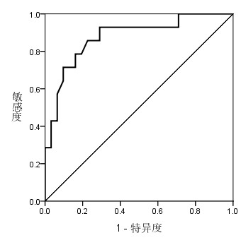 绘制ROC曲线结果显示,miR-21曲线下面积(AUC)为0.876(95%CI: 0.761~0.942),当截断值为2.25时约登指数最大(Youden =0.707),敏感度为92.9%,特异度为71.7%,见图 2。