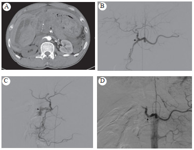 病例2患者男,38岁。因重物砸伤胸腰腹部疼痛1 h入院。无昏迷、呕吐、呕血,无胸闷、气急、呼吸困难,无腹胀、便血、血尿。查体:血压85/56 mmHg,心率120次/min,神志淡漠,上腹部见横行条片状青紫,胸廓挤压征阳性,呼吸音粗,腹肌紧张,呈板状腹,压痛反跳痛明显,肝脾肋下未及,肝区叩痛,肾区无叩痛,移动性浊音检查不合作,肠鸣音减弱。血常规:血红蛋白66 g/L,红细胞1.96×1012/L。CT检查示肝破裂,胰腺头颈部条状低密度,局部结构欠清,胃十二指肠动脉近段斑点状造影剂外溢(图 2A),右肾上腺挫伤伴血肿,多发肋骨骨折,盆腹腔大量积血。入院诊断:重物砸伤、闭合性腹部损伤、创伤性肝破裂、右肾上腺挫伤、失血性休克、多发肋骨骨折。给与输血补液扩容治疗同时急诊DSA:采用5F RH导管至腹腔动脉造影(碘海醇12 mL,速率4 mL/s,压力300 psi),造影示肝动脉走行正常,胃十二指肠动脉起始段局部隆起(图 2B),未见明显造影剂外溢,超选至胃十二指肠动脉造影, 其开口处见团块状造影剂外溢(图 2C),使用COOK 5 mm钢圈2个及1 mm明胶海绵颗粒适量栓塞后复查造影示造影剂外溢消失(图 2D),患者血压回升108/66 mmHg,心率下降至96次/min。术后保守治疗,未见复发出血,术后患者有低热、恶心、呕吐、腹痛、腹胀、胸痛、胸闷等表现,经对症处理后好转,未发生消化道出血胃肠道坏死或穿孔。