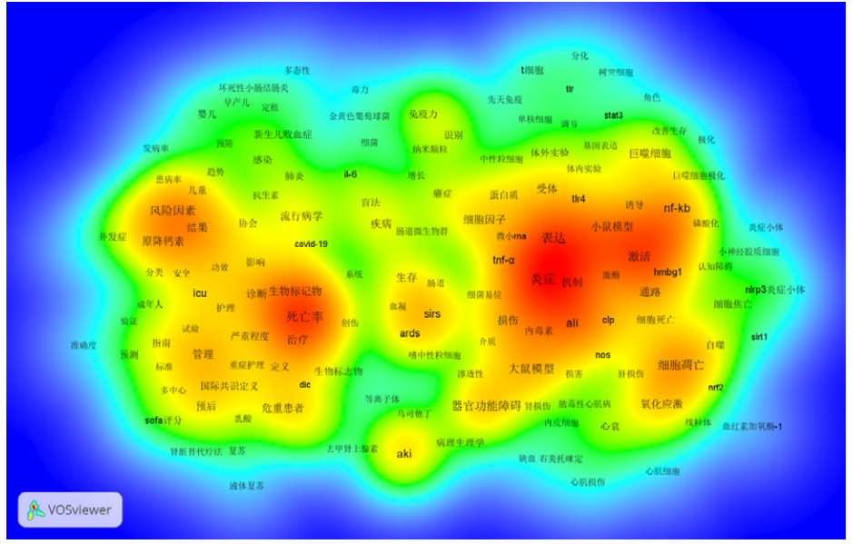 1.2 关键词密度可视化选择出现频次 > 50次的关键词,剔除高频检索词“sepsis”、“septic shock”、“bacteremia”、“shock”(“脓毒症”、“脓毒症休克”、“菌血症”、“休克”)及无意义检索词后,使用软件VOSviewer 1.6.18绘制关键词的密度视图以探究脓毒症的研究热点(见图 1)。中国近十年脓毒症的研究热点主要集中在两方面,一是以炎症、表达、机制、急性肺损伤等热度词为代表的基础研究,还包括盲肠结扎穿孔术、脂多糖、小鼠模型、大鼠模型等动物实验,细胞死亡、细胞凋亡等细胞表型,NF-κB通路、激酶等机制研究;二是以病死率、生物标志物、治疗、诊断等热度词为代表的临床研究,风险因素、降钙素原、管理、预后、国际共识等关键词热度较高。