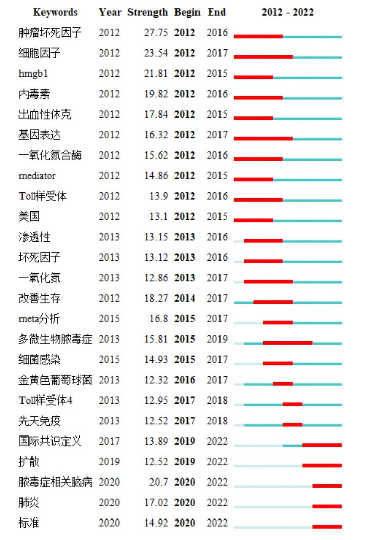 图 2 2012-2022年中国脓毒症领域前25个突现强度关键词 |