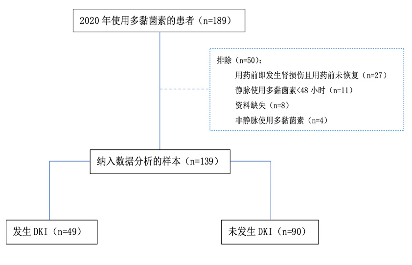 1 资料与方法 1.1 一般资料本研究是单中心回顾性病例对照研究,以评估本研究人群多黏菌素B致DKI的发病率和临床相关危险因素。该研究方案由医院伦理委员会审查并批准(伦理号:2021-SR-470)。共收集2020年1月1日至12月31日在医院接受多黏菌素B治疗的139例患者的临床信息,根据DKI是否发生,将患者分为两组:DKI组和非DKI组。分析使用多黏菌素B后发生和未发生DKI患者的临床特征,比较两组临床特征差异。