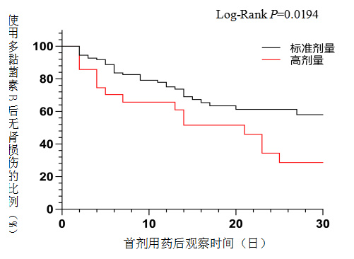 进一步构建了DKI组不同剂量的Kaplan–Meier分析(图 2),表明随着时间的增加,高剂量组比标准剂量组发生DKI的比例越高(Log-Rank P=0.019)。