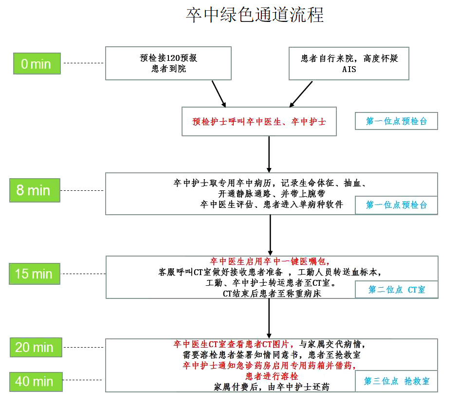 1.2 重塑以设立“一键卒中医嘱包”为核心的绿色通道流程原有绿色通道流程中,患者到医院后需经历预检分诊、转床至诊室,再由医生接诊、查体、评分、开立CT及各项检验等医嘱,而后患者家属付费后将患者转运至放射科进行CT检查,并在检验科进行抽血检验等流程。本研究采用“头脑风暴”、“精益管理”等管理方法[9]梳理以往AIS急诊急救关键流程,发现尽管在急诊绿色通道的设计上,整个医疗活动都发生同一楼层直径20~30 m区间内,但患者预约登记CT,排队检查、检验,及多次排队付费是导致DNT延长的主要因素。为此,本院自2021年开始试行以“卒中医嘱一键包”为核心的卒中全流程绿色通道重塑,去除流程中的各种动作浪费及时间浪费,尽力减少医生开立医嘱的时间和患者及家属往返诊室等环节。在预检台电脑中设置一键卒中医嘱包。医生不需要再使用诊室电脑开立医嘱。一键包医嘱启动后,其中的检查项目由信息后台自动批价流转至检查科室,患者无需付费即可直接检查。医嘱包内容包括:头颅CT、心电图、微量法血糖、血常规、凝血常规、生化、电解质、心肌损伤标志物等项目。流程改进内容包括:①组建卒中护士全程陪同跟进患者;②卒中医生接预报后在预检台接诊患者,并评估、启动一键医嘱包;③卒中医生跟进在CT室阅读CT片,评估、启动溶栓治疗。见图 1。