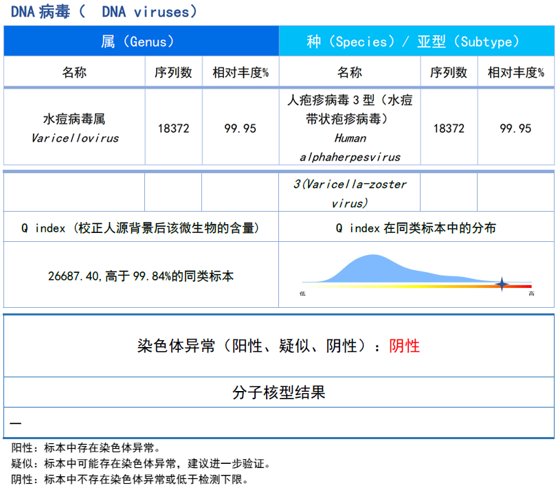 进一步诊断检查,外周血送检NGS,结果显示:VZV基因组序列测序18 362条,相对丰度99.95%;校正人源背景后VZV含量26 687.40,高于99.84%的同类标本。染色体基因检测结果阴性(图 1)。