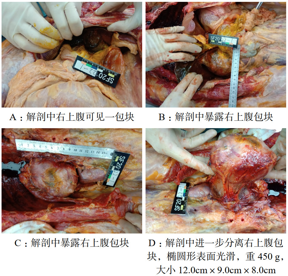 图 1 尸体解剖中发现的右上腹包块 |